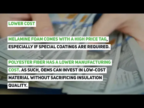 - Lower cost. Melamine foam comes with a high price tag, especially if special coatings are required to make it suitable for use in specific environments. In contrast, polyester fiber has a lower manufacturing cost, which, in turn, results in a lower purchasing cost. As such, OEMs can invest in low-cost material without sacrificing insulation quality.